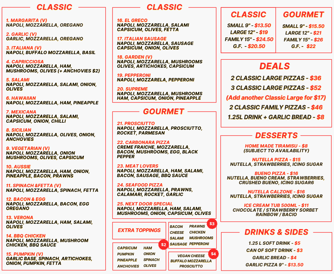 Overall, the menu at Next Door Pizza - Kingsbury delivers a satisfying mix of classic comfort and reliable execution, making it an easy go-to for casual dining. The offerings feel thoughtfully curated rather than overwhelming, with familiar favorites done well and priced reasonably for the quality. In particular, the Hawaiian Pizza stands out as a highlight, balancing its sweet and savory elements with a well-baked crust and generous toppings that reflect consistency in the kitchen. While the menu doesn’t try to reinvent the wheel, it succeeds in providing exactly what customers expect-flavorful, filling pizzas that hit the spot. As a whole, the selection leaves a positive impression, wrapping up the experience with a sense of dependability and simple enjoyment that keeps locals coming back.